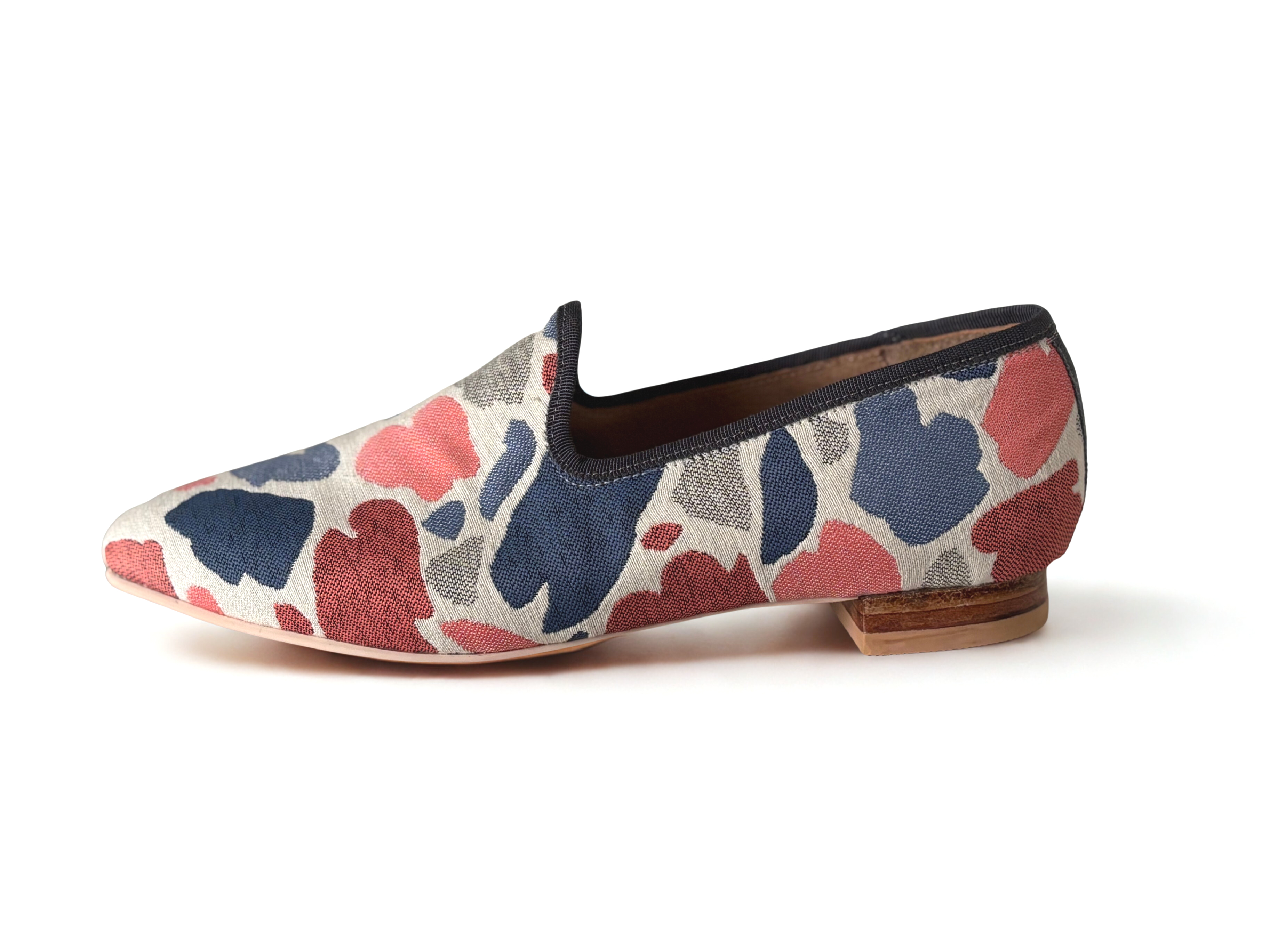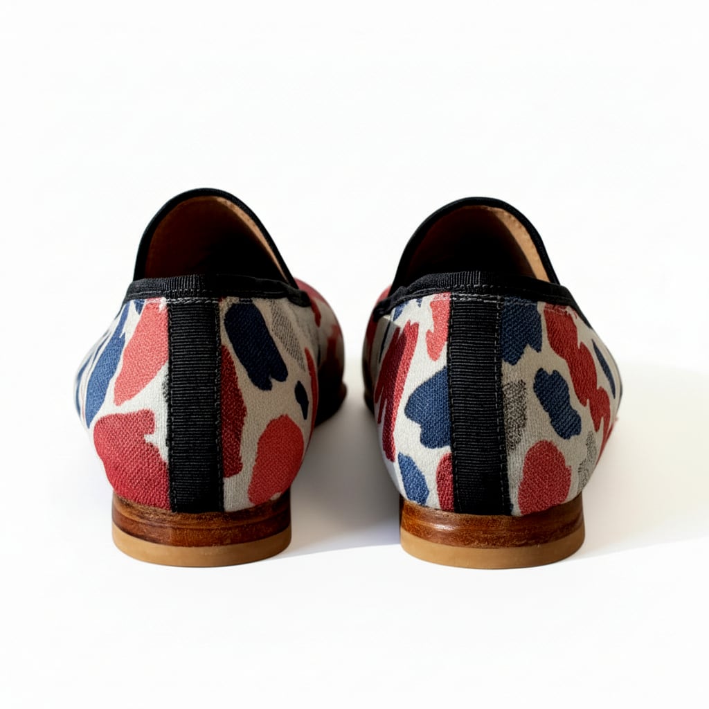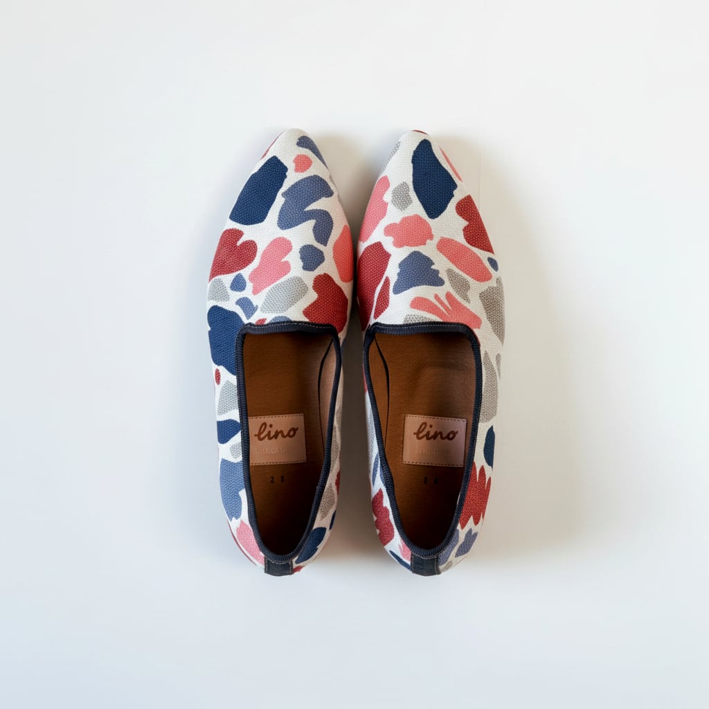 白地に、赤やブルー、グレーの有機的な柄が広がる一足。