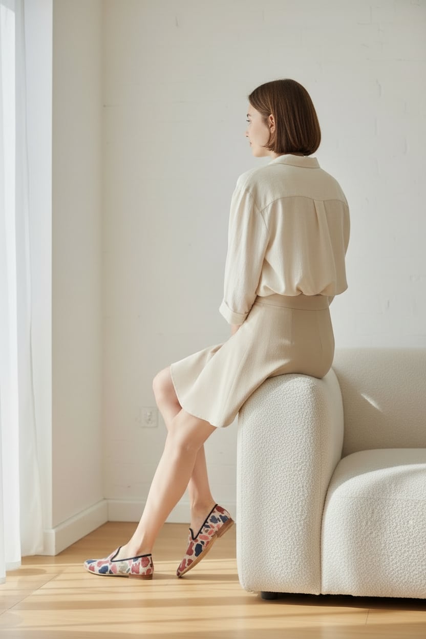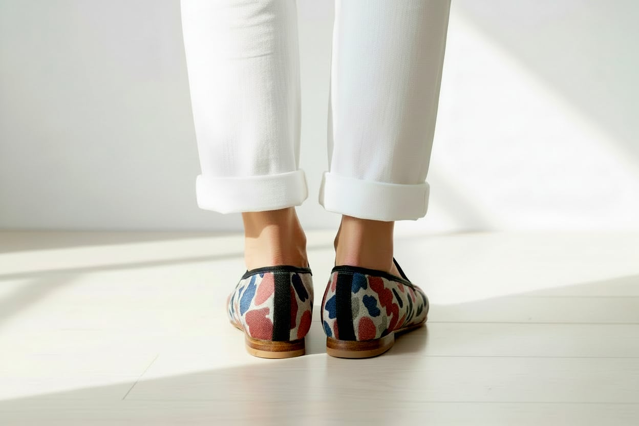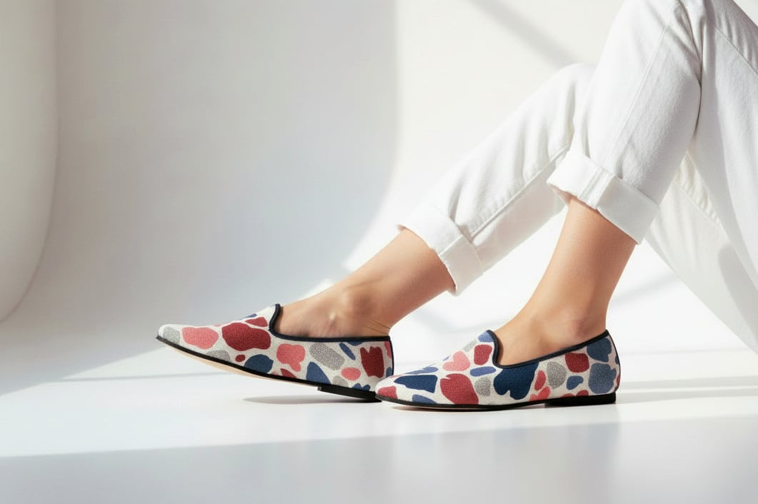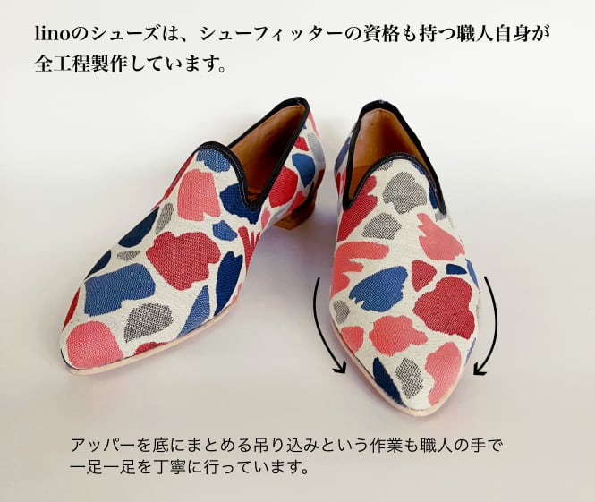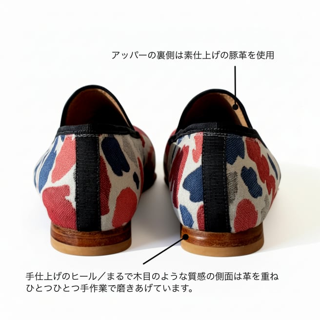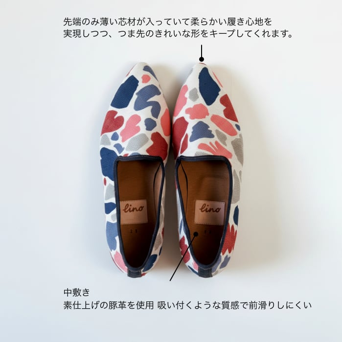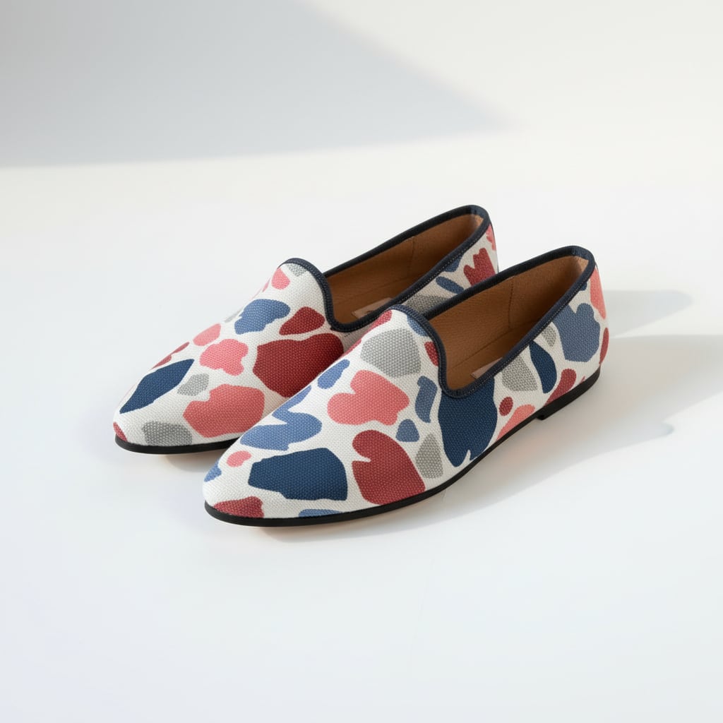 白地に、赤やブルー、グレーの有機的な柄が広がる一足。